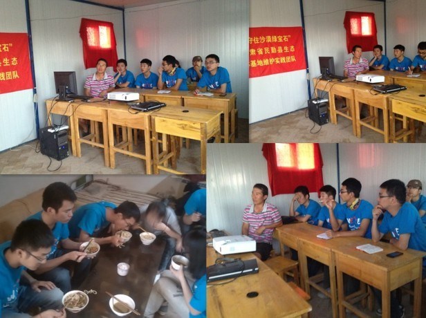 下午的太阳把基地的板房烤的跟蒸笼一样,这些困难是队员们临来就了解的,也都有心理准备,并没有抱怨。开始队员们先和马老师交换了问题和想法,告诉了马老师团队可以为民勤做些什么还有对民勤的问题。马老师也向队员们简短介绍了些情况。随着问题的深入,马老师开始了ppt讲解。就民勤沙漠化的地理原因,人文原因和历史原因讲述了民勤沙化的形成;从水利设施,农业环境和当地人心态介绍了治沙的困难;用政府关注的力度,当地现在使用的技术和特色农果物表达了民勤人民治沙的决心。