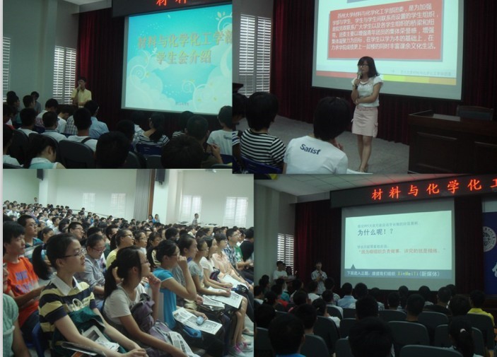 2013年8月25日上午8时30分,材料与化学化工学部学生组织见面会在苏州大学独墅湖校区一期907幢1101厅举行。与会的有各大学生组织代表和全体2013级新生,参与介绍的学生组织有我部团委、新媒体、学生会、学生科技协会、社团联合会以及《萃取》报社。各大组织依次做宣传和介绍,会场气氛活跃,不时爆发阵阵掌声。