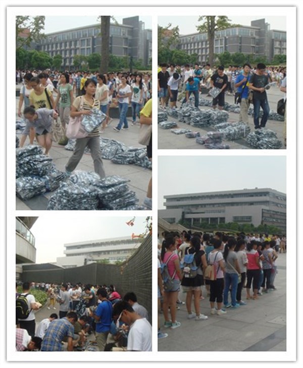2013年8月25日下午两点,新生报到后的第三天。苏州大学材料与化学化工学部的2013级新生排着整齐的队伍前往炳麟图书馆北广场领取军训服装。尽管天公不作美,乌云遮住天空,不时有零星的雨滴落下,但却丝毫没有影响同学们高涨的热情。