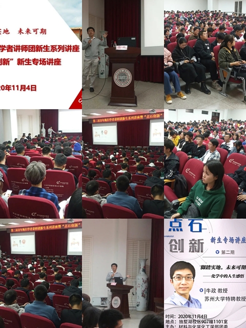 2020年11月4日,由材料与化学化工学部团委主办,学生科技协会承办的第二届青年海归学者讲师团新生系列讲座暨“点石创新”新生专场讲座于苏州大学独墅湖校区907幢1101室举办。本次讲座邀请到牛政教授主讲,2020级新生参加讲座,旨在培养同学们对化学学习的兴趣与动力,为以后更深入的学习打下扎实的基础。