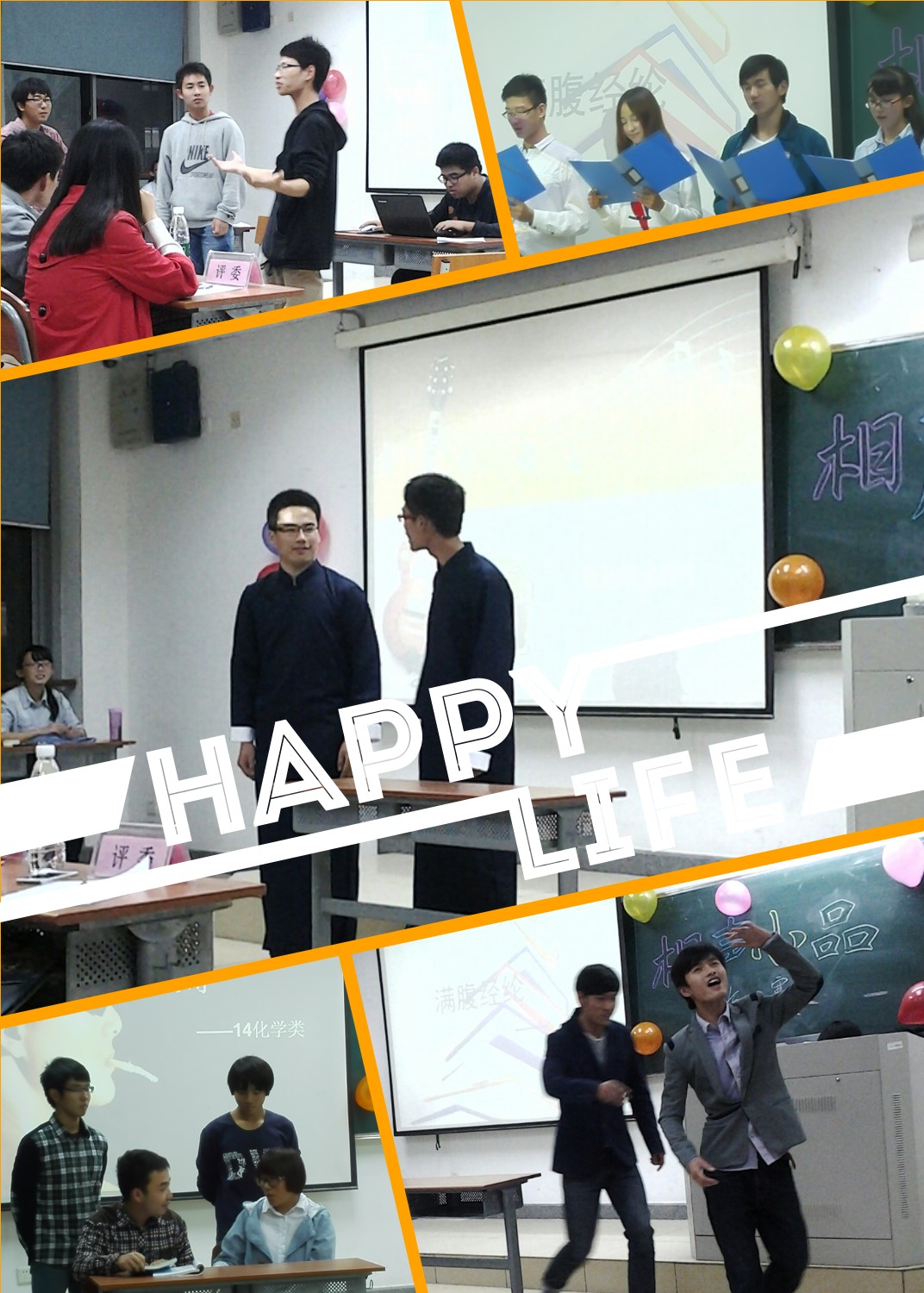 18时30分,初赛在四位主持人诗一般的开场白中拉开帷幕!首先,由来自材料与化学化工学部的杨子涵和何子涵带来的相声-----《我的学生时代》。他们调侃地讲述了学生时代的事情,一捧一逗,配合默契,现场掌声雷鸣。紧接着是小品《杀死大哥》,2014级化学类倾情原创,搞怪的演绎让人忍俊不禁。而兄弟院系纳米科学技术学院的同学则精彩演绎了小品《男生宿舍的蜕变》,然后连着四个是材料与化学化工学部的小品,分别是《扶不扶》、《我的大学》、《女生宿舍,男生止步》和《小鲜肉上大学》,也都很抢眼。东吴相声社也派出代表,带来一段相声《抬杠》,表演十分到位,值得其他队伍学习。最后是材料与化学化工学部2014级强化班的现代相声《这是三国吗》,在演员神采飞扬、口若悬河,娓娓道来之际,观众已是啼笑皆非。其间,每个参赛小组表演结束后,评委都给出了颇具建设性的意见。