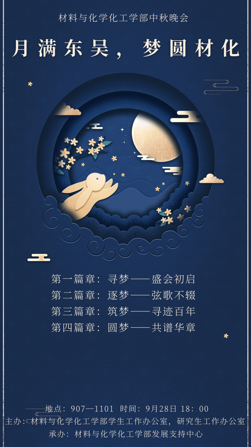 金风荐爽,玉露生凉,丹桂香飘,银蟾光满。中秋佳节将至,东吴良宵月圆。材料与化学化工学部于9月28日18:00在907-1101举办中秋晚会,诚挚邀请各位老师与同学参加!
