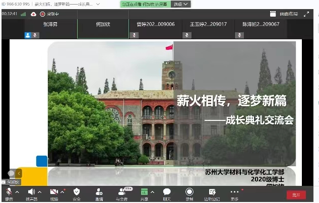 为充分发挥榜样力量,推动学部学风建设,更好的帮助2023级研究生新生确立奋斗目标。2023年9月15日晚18:30,苏州大学材化部举办“薪火相传,逐梦新篇”研究生成长典礼线上交流会。本次活动由材化部优秀毕业生何加钦、董洪春、周琪、林元城主讲,23级硕士研究生董孟琳主持,全体2023级硕博新生参与。