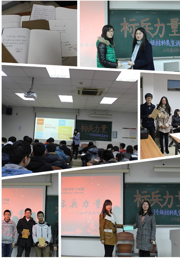 2015年3月15日18:30,由材料与化学化工学部2014级材料班举办的“标兵力量”宣讲会正式开始。此次活动旨在与同学们分享标兵在学习生活中的经验,从而对大家有所启迪和帮助。