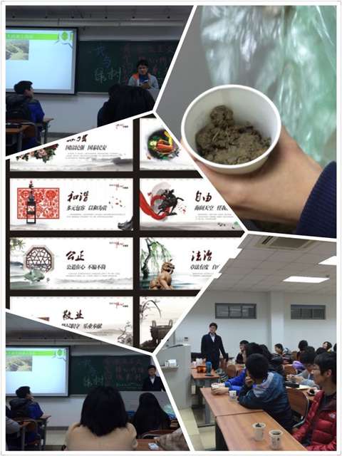 活动伊始,主持人彭鑫楠首先播放了一段《穹顶之下》的视频,引起同学们对当今严峻环保局势的清醒认识。接着由班级里面对环保有较深认识的戴以恒同学为大家讲述环保的必要性和紧迫性,以及当今社会对环保的态度,环保领域的最新研究。然后同学们以小组为单位,讨论我们当代大学生能为环保做些什么,在表达的环节,同学们踊跃的发言,现场气氛十分活跃。最后,由各组组长领取和发放泥土种子,并让各个同学在自己的杯子中种下属于自己的环保梦想。