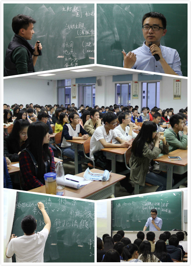 团课上,黄郁健用互动的形式,对团学骨干的公文写作进行指导。从基础的请假条到四代会会议请示、从活动部的活动策划到宣传部的海报制作,随机挑选同学上讲台板书,互相改正。同学们互相指正、学习,气氛热烈。