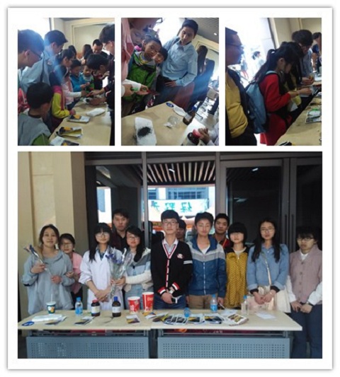 2015年4月19日下午,材料与化学化工学部青年志愿者协会工作人员带领志愿者们前往李公堤参加晒书会志愿活动。此次活动主题为“趣味实验,科普宣传”,旨在通过趣味实验普及科普小常识。