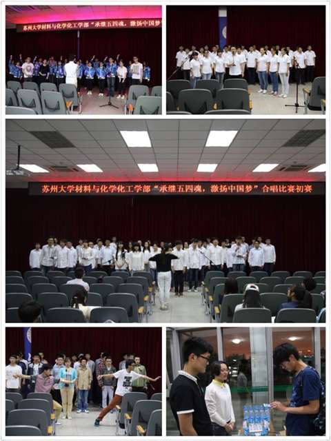 2015年4月28日18时,苏州大学材料与化学化工学部““承继五四魂 激扬青春梦”五四大合唱初赛于907幢1101室顺利举行。材料与化学化工学部团委书记黄郁健、学工办副主任俞仁琰、2014级辅导员李睿及辅导员助理郑星参与评审,学生会工作人员负责维持现场秩序。