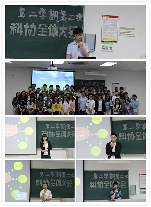 18时30分,简单的开场白后,主持人宣布会议正式开始。首先,由理事长刘瑞敏发言,换届在即,但他并没有放松对大家的要求,而是认真负责地指出当前组织中存在的问题和不足,他特别指出,宣传部的海报在配图、字体、标志等方面有待改善。接着,各部门代表总结上个月的工作,并阐述接下来的工作计划。一番交流后,大家都认识到自己不足,同时,也对2014级干事的工作表示了肯定。大会最后,在理事长刘瑞敏的提议下,几位副理事长都进行了发言,他们回忆着与学生科技协会一起度过的点点滴滴,并表示希望大家好好珍惜在组织中相处的每分每秒。