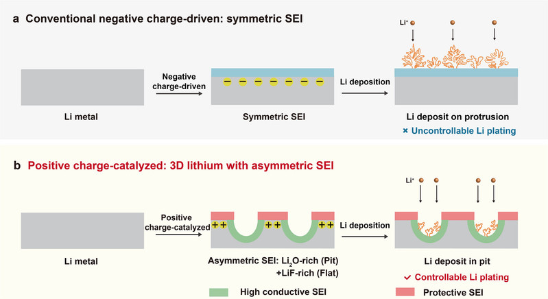 Abstract: The practical application of lithium metal anodes is hindered by uncontrolled dendrite growth, which compromises battery safety and cyclability. Conventional strategies focus on modifying electrolyte compositions or interfacial coatings but fail to fundamentally regulate lithium deposition at the nanoscale. Here, Electrostatic catalysis-driven asymmetric solid-electrolyte interphase (SEI) formation, achieved via a pulsed positive voltage pretreatment, is introduced. This process induces site-selective decomposition of electrolyte components, generating LiF-rich SEI on flat surfaces and Li2O-rich SEI in surface pits, thereby directing lithium plating into pits and suppressing dendrite formation. Experimental and computational studies reveal that electrostatic enrichment of PF6− anions at positively charged interfaces accelerates their decomposition, while pit regions, depleted of anions, promote solvent-derived Li2O formation. Lithium metal anodes with this asymmetric SEI exhibit stable cycling for over 350 h at 1 mA cm−2, outperforming conventional SEI. Full cells paired with LiCoO2 (LCO) cathodes achieve 96.1% capacity retention after 400 cycles at 1 C, compared to 56.8% for conventional SEI. These findings introduce electrostatic catalysis as a powerful interfacial engineering strategy, enabling high-performance lithium metal batteries through precise SEI control.