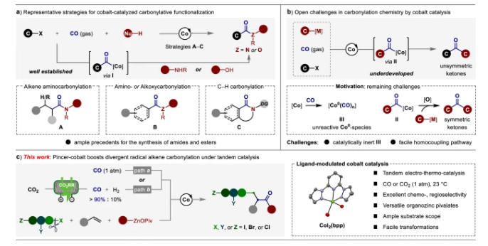 Abstract: Catalytic multicomponent carbonylation reactions with high regio- and chemoselectivity represent one of the long-pursued goals in C1 chemistry. We herein disclose a practical cobalt-catalyzed divergent radical alkene carbonylative functionalization under 1 atm of CO at 23 °C. The leverage of the tridentate NNN-type pincer ligand is the key to avoid the formation of catalytically inert Co0(CO)n species and overcome the occurrence of oxidative carbonylation of organozincs, selectively tuning the catalytic reactivity of cobalt center for dictating a full cobalt-catalyzed four-component carbonylation. Moreover, direct use CO2 as the C1 source in the multicomponent alkene carbonylative couplings can be achieved under a tandem electro-thermo-catalysis, thus allowing us to rapidly and reliably construct unsymmetric ketones with ample scope and excellent functional group compatibility. Remarkably, our protocol encompasses a broader of polyhaloalkanes as the electrophiles, which underwent radical-relay couplings in a completely regio- and chemoselective fashion. Finally, facile modifications of drug-like molecules demonstrate the synthetic utility of this method.