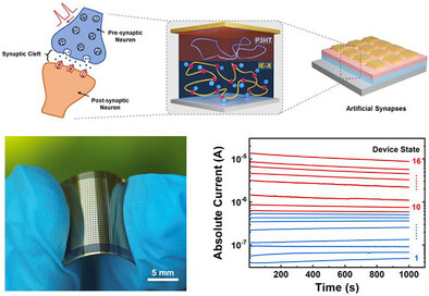 Abstract: An organic heterostructure, composed of an ionoelastomer that comprises polycationic chains and mobile anions, and a semiconducting polymer, forms a new class of artificial synapses. These ionoelastomer synapses update their synaptic weights by modifying device conductance through the spatial redistribution of anions in response to electrical stimuli. The memory effect of these synapses is highly dependent on the specific anion species present, providing a unique means to modulate synaptic plasticity simply through anion selection. The continuously programmable and nonvolatile states of the selected ionoelastomer synapse are harnessed to emulate a soft neural network and perform the handwritten digit and fashion image recognition tasks, which achieve high recognition accuracies comparable to ideal numeric model but only using 16 discrete device states.