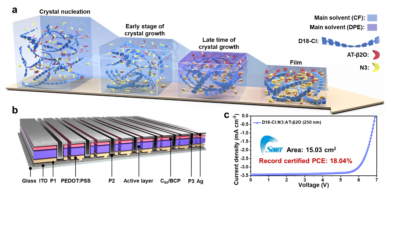 该论文解决了有机太阳能电池效率(PCE)随活性层膜厚增加急剧衰减的问题,获得纪录认证效率的小面积单节(PCE = 20.43%,0.062 cm2)和大面积模组(PCE = 18.04%,15.03 cm2)有机太阳能电池。论文以苏州大学为第一及唯一通讯署名单位发表。第一作者为苏州大学博士后陈海阳,通讯作者为苏州大学李耀文教授。