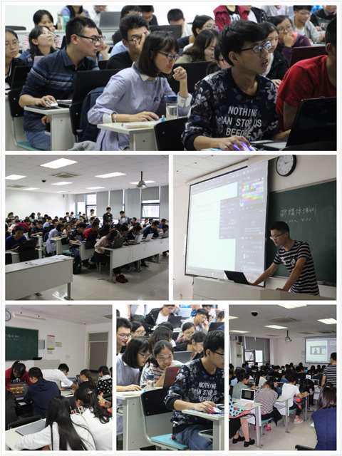 下午2时,培训正式开始,张威进行简单的自我介绍后迅速切入主题。他指出,学部海报有五大要素:主、副标题,活动主题词,活动时间、地点,主、承办方以及背景图片。紧接着,他按照制作海报的一般步骤,向同学们讲解并演示如何操作软件。为了帮助新生更好地掌握Photoshop的应用,张威在每讲解完一种工具后,都给予大家充足的时间自由操作、提问和交流,让他们熟悉操作步骤。新媒体中心其他成员则在台下为学员们答疑解惑。培训最后,新媒体中心宣传制作中心主任蒋金星向大家讲解了如何制作表情包,并对此次培训进行总结。至此,此次活动落下帷幕。