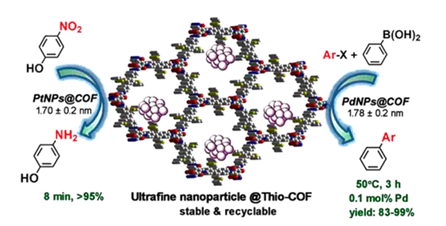 Covalent organic frameworks (COFs) with well-defined and customizable pore structures are promising templates for the synthesis of nanomaterials with controllable sizes and dispersity. Herein, a thioether-containing COF has been rationally designed and used for the confined growth of ultrafine metal nanoparticles (NPs). Pt or Pd nanoparticles (Pt NPs and Pd NPs) immobilized inside the cavity of the COF material have been successfully prepared at a high loading with a narrow size distribution (1.7 ± 0.2 nm). We found the crystallinity of the COF support and the presence of thioether groups inside the cavities are critical for the size-controlled synthesis of ultrafine NPs. The as-prepared COF-supported ultrafine Pt NPs and Pd NPs show excellent catalytic activity respectively in nitrophenol reduction and Suzuki–Miyaura coupling reaction under mild conditions and low catalyst loading. More importantly, they are highly stable and easily recycled and reused without loss of their catalytic activities. Such COF-supported size-controlled synthesis of nanoparticles will open a new frontier on design and preparation of metal NP@COF composite materials for various potential applications, such as catalysis and development of optical and electronic materials.