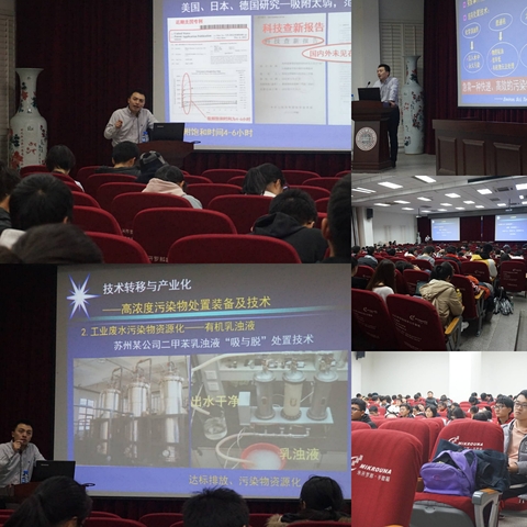 随着同学们的陆续到场,活动准时开始。陈冬赟重点围绕微纳材料进行介绍,对微纳功能环保材料在环境治理中的应用进行说明。他从微纳材料在两种不同类别的污染中的实际应用入手,介绍了该种材料对污染物快速高效处理的原理和应用、该种材料的社会影响以及未来的研究方向。此外,陈冬赟还对2019级新生进行学习生活指导。他形容大一学生为一张白纸,刚从高考的桎梏中解脱,在这个时段,学生最有梦想,不应废弃学习,更不能心浮气躁;紧随其后的大二,最初的梦想开始生根发芽,不论有怎样的爱好,都应该为未来做好规划;大三是个分水岭,这个时期学生应该回想初衷,再做出人生重要的决定,切勿盲目从众;大四是同学们即将分道扬镳各奔前程的时期,此时的未来,即是过去埋下种子的果实。讲座最后,陈冬赟用海明威的名言告诉同学们“在人生的交叉路口而没有红绿灯”。伴随着同学们热烈的掌声,本次讲座圆满结束。