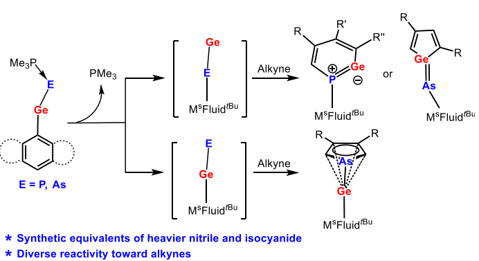 The reactions of chlorogermylene Ms FluindtBu-GeCl 1, supported by a sterically encumbered hydrindacene ligand Ms FluindtBu, withNaPCO(dioxane)2.5 and NaAsCO(18-c-6) in the presence of trimethylphosphine afffforded trimethylphosphinestabilized germylidenyl-phosphinidene 2 and -arsinidene 3, respectively. Structural and computational investigations reveal that the Ge−E′ bond (E′ = P and As) features a multiple-bond character. 2 and 3 exhibit diverse reactivity toward trimethylsilylacetylene and 4-tetrabutylphenylacetylene. Specififically, 2 underwent cycloadditions with both alkynes affffording the fifirst sixmembered aromatic phosphagermabenzen-1-ylidenes 4 and 5, respectively, through the heavier isocyanide intermediate Ms FluindtBu-PGe. In contrast, 3 could serve as a synthetic equivalent of heavier isocyanides and nitriles when treated with trimethylsilylacetylene and 4-tetrabutylphenylacetylene yielding arsagermene 6 and arsolylgermylene 7, respectively. The reaction mechanisms for the cycloadditions were investigated through density functional theory calculations. The reactivity studies highlight the potential of 2 and 3 in accessing heavy main-group element-containing heterocycles.