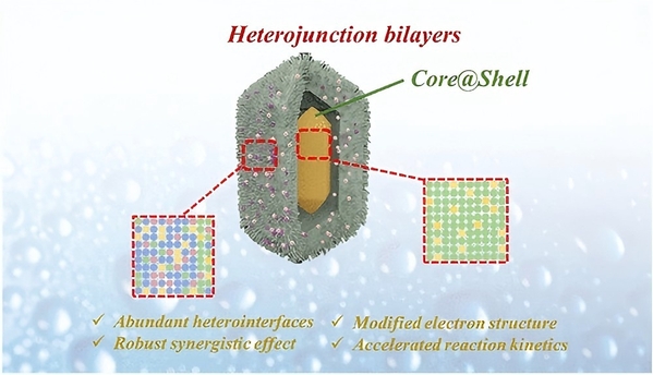 Abstract: Interface engineering in conjunction with atomic doping has emerged as a powerful paradigm for constructing highly efficient catalysts for the oxygen evolution reaction (OER). Herein, we design Ir-doped FeSe@CoNiFeSe (Ir-FeSe@CoNiFeSe) as an efficient OER catalyst that integrates a triple-synergistic effect of “core@shell confinement-heterointerface-atomic doping”. The strong interactions between the FeSe core and CoNiFeSe shell endow the catalyst with abundant active sites. Moreover, the favorable Ir doping promotes charge transfer and modulates the electronic structure of the Co/Ni/Fe sites, significantly accelerating the reaction kinetics and enhancing the conductivity. Collectively, benefiting from the hollow core@shell structure, effective Ir doping, and abundant active sites at the heterointerfaces, the Ir-FeSe@CoNiFeSe exhibits remarkable OER performances in alkaline media, delivering a lower overpotential of 209 mV at 10 mA cm–2 and maintaining exceptional durability beyond 70 h. In the two-electrode configuration, an Ir-FeSe@CoNiFeSe anode coupled with a Pt/C cathode sustains an overall water splitting at 10 mA cm–2 over 45 h with a cell voltage of only 1.44 V, lower than the benchmark RuO2//Pt/C (1.58 V). This work not only validates the synergistic effect of the “core@shell confinement-heterointerface-atomic doping” in electrocatalysis but also underscores the promising prospect of combining interface engineering with atomic doping to enhance electrocatalytic performance.