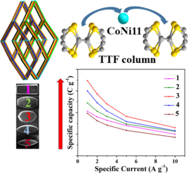 Abstract: Integrating mixed-metal ions and redox-active ligands into bimetal–organic frameworks (BMOFs) represents a promising yet relatively underexplored strategy for enhancing positrode performance in emerging supercapatteries. This work presents a series of isostructural monometal–organic frameworks (MMOFs,1 and5) and BMOFs (2,3, and4) with varying Co(II)/Ni(II) ratios and a redox-active tetrathiafulvalene (TTF) ligand. MOFs1–5 exhibit a high-density three-dimensional 8-fold interpenetrating diamond-like topology. Competitive coordination from secondary metal ions enables unprecedented systematic control over the crystal morphology. Combined experimental and theoretical analyses reveal enhanced conductivity resulting from synergistic interactions between mixed-metal ions and the TTF ligand, with the Co/Ni 1:1 ratio (MOF3) exhibiting optimal electron transport. Notably, iodine-treated BMOF3 (3-ox) achieves a specific capacity of 884.3 C g–1 at 1 A g–1. The AC||3-ox supercapattery delivers a specific energy of 91.8 Wh kg–1 at 0.97 kW kg–1, surpassing that of other CoNi-MOF-based electrodes. The device retains 87.5% of its capacity after 10,000 cycles. This work proposes a novel strategy for designing MOF-based supercapattery electrodes using BMOFs with redox-active ligands, which diverges from conventional metal-centric approaches to achieve targeted electrochemical performance.