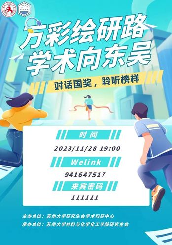“心中有榜样,行动有力量。”为充分发挥国家奖学金获奖者的引领作用,进一步提高研究生的学术能力与实践水平,苏州大学研究生会举办“万彩绘研路 学术向东吴“系列学术沙龙活动。材料与化学化工学部将于2023年11月28日19:00在Welink会议平台举办“对话国奖,聆听榜样”主题活动,届时学部国奖学生代表将分享他们在学习、竞赛、科研等方面的经验。