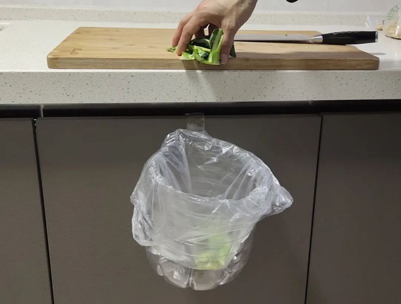将喝完的水桶从中部剪开,上半部分只保留用来连接瓶口和下半部分瓶身的连接条,并将连接条夹在厨房的橱门里制成一个可以循环使用的厨余垃圾桶。
