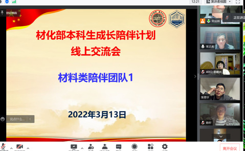 根据《苏州大学立德树人之本科生成长陪伴计划指导方案》的工作要求,材化部2021级20支陪伴团队于3月份开展了本学期的第一次陪伴活动。各团队利用云中苏大线上会议和腾讯会议等平台,由团队的德政导师或学业导师作为主持人,开展了以专业、线上教学为重点,涉及考研、保研、进入课题组、专业分流等一系列话题交流。2020级生活导师作为团队联络人,根据统一要求协调开展陪伴活动,团队中的研究生和博士生与2021级同学一起参加了陪伴活动。会上,21级同学们积极参与互动并提问,与团队导师们深入讨论。