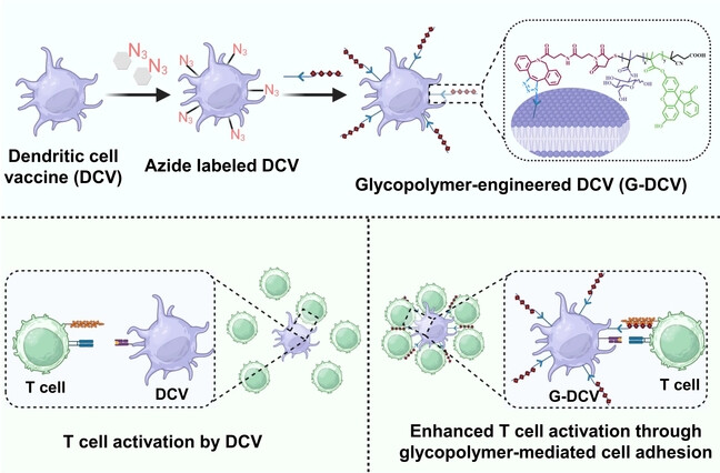 Abstract: Dendritic cell vaccine (DCV) holds great potential in tumor immunotherapy owing to its potent ability in eliciting tumor-specific immune responses. Aiming at engineering enhanced DCV, we report the first effort to construct a glycopolymer-engineered DC vaccine (G-DCV) via metabolic glycoengineering and copper-free click-chemistry. Model G-DCV was prepared by firstly delivering tumor antigens, ovalbumin (OVA) into dendritic cells (DC) with fluoroalkane-grafted polyethyleneimines, followed by conjugating glycopolymers with a terminal group of dibenzocyclooctyne (DBCO) onto dendritic cells. Compared to unmodified DCV, our G-DCV could induce stronger T cell activation due to the enhanced adhesion between DCs and T cells. Notably, such G-DCV could more effectively inhibit the growth of the mouse B16-OVA (expressing OVA antigen) tumor model after adoptive transfer. Moreover, by combination with an immune checkpoint inhibitor, G-DCV showed further increased anti-tumor effects in treating different tumor models. Thus, our work provides a novel strategy to enhance the therapeutic effectiveness of DC vaccines.