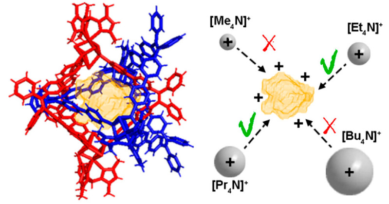 Abstract:Although interlocked three-dimensional molecules display unique properties associated with their spatial structures, their synthesis and study of their host−guest properties remain challenging. We report the formation of a novel [2]catenane, [Et4N]@[(Tp*WS3Cu3Cl)2 (cis-bpype)3]2(OTf)5 ([Et4N][1](OTf)5), by self-assembly of the cluster node [Tp*WS3Cu3Cl]+ and the organic linker (Z)-1,2-diphenyl-1,2-bis(4-(pyridin-4-yl)phenyl) ethene (cis-bpype). Single-crystal X-ray and NMR analyses established that [1]4+ is formed by the interpenetration of two cluster-organic cages. Unique cation-in-cation host−guest complexes were observed with this catenane. The crystalline, empty catenane was formed by taking advantage of the electrostatic repulsion-induced weak binding of the host. Encapsulation experiments also reveal that the empty catenane can adaptively encapsulate cations such as [Et4N]+ and [Pr4N]+ in the cross cavity but is unable to encapsulate [Bu4N]+ and [Me4N]+ , although the size of the latter is compatible with that of the cavity. Theoretical calculations and volume analysis allow to unravel the ingenious role of catenane structures and the interplay between electrostatic repulsion and attractive noncovalent interactions for size-specific recognition behavior in host-guest systems involving species with similar electric charges.