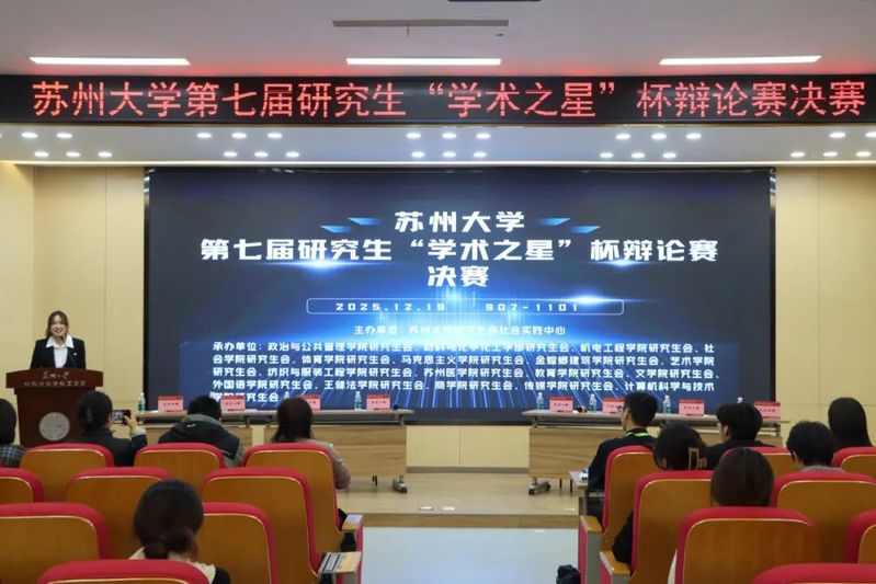 2025年12月19日晚18:00,由苏州大学研究生会社会实践中心主办的苏州大学第七届研究生“学术之星”杯辩论赛决赛于独墅湖校区材料与化学化工学部907号楼圆满落幕。本场决赛由政治与公共管理学院研究生会与材料与化学化工学部研究生会联合举办,两院通力协作,精心筹备,共同呈现了这场跨学科学术思辨的盛会。