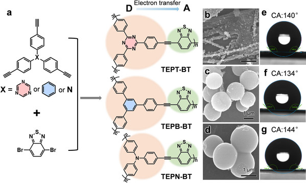 Abstract: Hydrogen peroxide (H2O2) photosynthesis by two-electron oxygen reduction reaction (ORR) is a promising eco-friendly approach. However, some intrinsic limitations of photocatalytic materials and constrained reaction environments hinder the improvement of catalytic performance. Conjugated polymer materials are widely studied as photocatalysts owing to their diverse building blocks and tunable electronic structures. In this study, hydrophobic benzothiadiazole (BT)-based conjugated polymers with donor–acceptor (D–A) structures, namely TEPT-BT, TEPB-BT, and TEPN-BT, are designed by changing the donor molecular center. In a pure water/air environment with TEPT-BT, H2O2 is efficiently produced at a rate of 2540.2 µmol g−1 h−1. Density functional theory calculation results revealed that the triazine ring of 2,4,6-tris(4-ethynylphenyl)-1,3,5-triazine (TEPT) served as an additional electron acceptor other than BT. This feature endows TEPT-BT with an optimal arrangement of redox centers, thereby enhancing exciton separation efficiency. Moreover, the triazine ring functioned as a powerful oxygen (O2) adsorption site to promote H2O2 photosynthesis under the synergistic effect of asymmetric dual ORR active sites. This study offers a promising approach for designing new hydrophobic D–A type conjugated polymer photocatalysts.