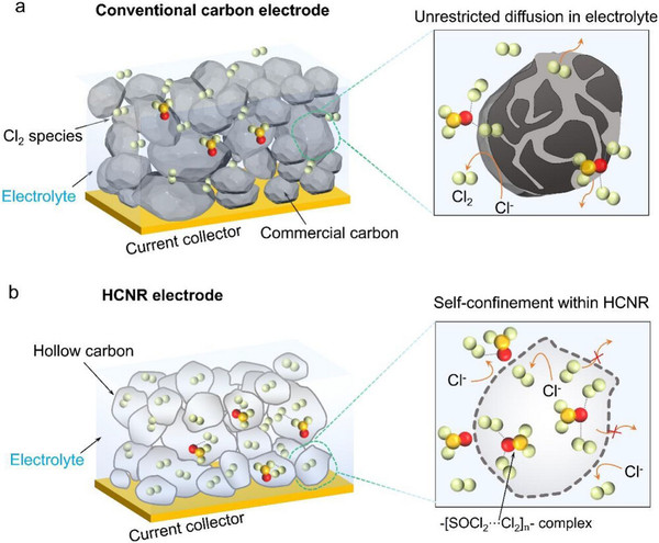 Abstract: Rechargeable Li-Cl2 batteries represent a promising high-energy-density technology. However, the open-pore structure of conventional cathode materials poses a fundamental challenge by permitting the uncontrolled diffusion of Cl2 into the electrolyte, resulting in severe local concentration dilution that plagues rate capability and specific capacity. Herein, a self-confinement strategy by hollow carbon nanoreactors (HCNRs) is proposed to regulate the local concentration of active Cl2 species with micropores (≈0.8 nm) on their walls. These micropores act as size-selective barriers, allowing to block the escape of larger active Cl2 species (kinetic diameter ≈0.86 nm), and mesopores (30-50 nm) function as nanoreactors that concentrate active Cl2 species. This design enables the as-assembled Li─Cl2 cell to achieve an ultrahigh current density of 100 mA cm-2 during thecharge/discharge process and a record-breaking specific capacity of 8000mAh g-1 (9 mAh cm-2 ), superior to the reported literature. This hollow nanoreactor design highlights the potential of Li-Cl2 batteries as high-power and energy-dense systems, paving the way for their practical application.