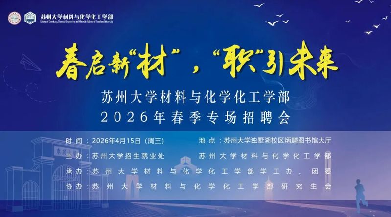 为全面落实党中央、国务院对高校毕业生就业创业工作的决策部署,紧紧抓住2026届春招有利时机,全力做好毕业生就业服务工作,促进毕业生高质量充分就业,现定于2026年4月15日(周三)举办春启新“材”,“职”引未来——苏州大学材料与化学化工学部2026年春季专场招聘会。