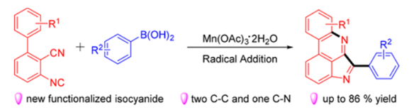 A Mn(III) mediated cascade cyclization of new designed multifunctionalized 3-isocyano-[1,1′-biphenyl]-2-carbonitrile with arylboronic acid to construct pyrrolopyridine derivatives is developed. A series of pyrroloporidine compounds have been constructed through the formation of two new C–C bonds and one C–N bond via a radical pathway.