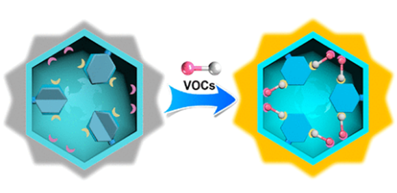 Light-up luminescence sensors have been employed in real-time in situ visual detection of target molecules including volatile organic compounds (VOCs). However, currently employed light-up sensors, which are generally based on the aggregation-induced emission (AIE) or solvent-induced energy transfer effect, exhibit limited sensitivity for light-up detection and poor recycling performances thereby significantly hindering their industrial applications. Inspired by the low-temperature enhanced luminescence phenomenon, we herein propose and show that a guest-lock-induced luminescence enhancement mechanism can be used to realize the ultrafast light-up detection of target VOCs. Through introduction of chlorinated hydrocarbons to lock the molecular vibrations within a designed [Cu4I4]-based metal–organic framework (MOF), luminescence intensity could be enhanced significantly at room temperature. This guest-lock-induced luminescence enhancement is brought about by weak supramolecular interactions between the host framework and the guest molecules, allowing highly sensitive and specific detection of the guest vapor with ultrafast response time (<1 s). Single-crystal X-ray diffraction (SCXRD) analysis of guest molecules-loaded MOFs and density functional theory (DFT) calculations were employed to investigate the host–guest interactions involved in this phenomenon. Moreover, the above MOF sensor successfully achieved real-time detection of a toxic chloroaromatic molecule, chlorobenzene. The guest-lock-induced light-up mechanism opens up a route to discovering high-performance ultrafast light-up luminescent sensors for real-time detection applications.