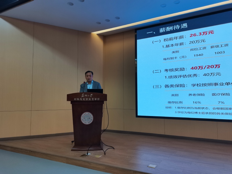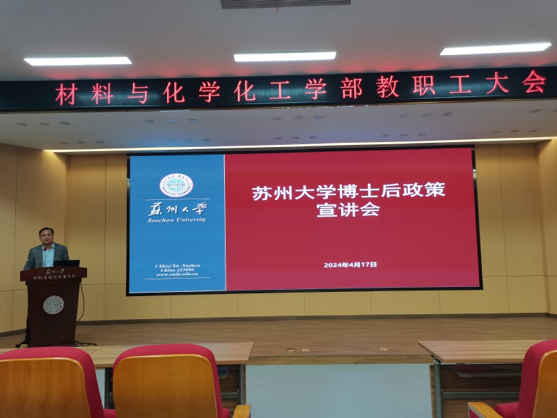 2024年4月17日,材料与化学化工学部召开苏州大学博士后政策宣讲会。材化部主任张正彪教授做政策宣讲,材化部具有正高职称的教师参加会议。