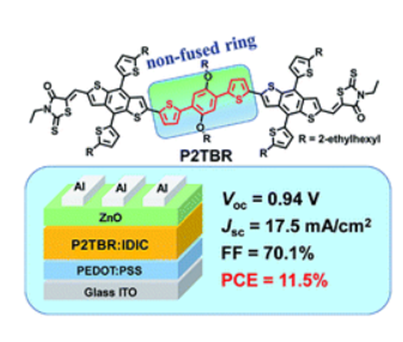 A novel p-type organic semiconductor (p-OS), P2TBR, based on a non-fused ring structure of thiophene–benzene–thiophene (TBT) as the core and 2D-conjugated benzodithiophene (BDT) units as π spacers and 3-ethylrhodanines as terminal groups, was synthesized and used as the donor material for all-small-molecule organic solar cells (SM-OSCs). P2TBR shows strong absorption, a low-lying HOMO energy level, high hole mobility and good thermal stability. The optimized P2TBR:IDIC film exhibits face-on and edge-on co-existent texture and three dimensional (3D) charge pathway, which is far better than the face-on orientated blend film without any treatment. As a result, a notable power conversion efficiency (PCE) of 11.5% and a satisfactory fill factor (FF) of 70.1% are achieved. This efficiency is the highest PCE for non-fullerene SM-OSCs reported in the literature so far. Overall, the results indicate that P2TBR is a promising candidate p-OS donor material for use in SM-OSCs, and the molecular design strategy for P2TBR provides the possibility that the simple-structured and easy to chemically modify non-fused unit can also be used as a building block in high performance p-OS donors.