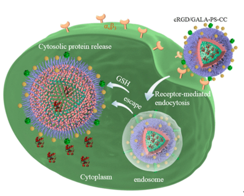 Low cell selectivity and uptake coupled with endosomal entrapment pose critical hurdles for intracellular delivery and clinical translation of therapeutic proteins. Herein, we report that smart polymersomes dually functionalized with cRGD and fusogenic GALA peptides (cRGD/GALA-Ps) enable ανβ3-specific and high-efficiency cytosolic delivery of cytochrome C (CC), a model apoptotic protein, to A549 human lung cancer cells. cRGD/GALA-Ps was prepared with 20 mol % cRGD and varying GALA contents from 2 to 4 to 6 mol % via coassembly of PEG-b-poly(trimethylene carbonate-co-dithiolane trimethylene carbonate)-spermine (PEG-b-P(TMC-co-DTC)-spermine), cRGD-PEG-b-P(TMC-co-DTC), and maleimide-PEG-b-P(TMC-co-DTC) and postmodification using GALA-SH (sequence: CWEAALAEALAEALAEHLAEALAEALEALAA). cRGD/GALA-Ps loaded with ∼13 wt % CC displayed a small size of about 65 nm and fast glutathione-triggered protein release. Interestingly, cRGD/GALA-Ps maintained a similar targeting ability to cRGD-Ps in ανβ3-positive A549 lung cancer cells, while markedly enhanced cytosolic release of FITC-labeled CC, as revealed by confocal microscopy. MTT assays exhibited that CC-loaded cRGD/GALA-Ps was significantly more potent than CC-loaded cRGD-Ps, in which cell viabilities of 76.2, 51.0, 29.6, and 35.5% were discerned for cRGD/GALA-Ps with 0, 2, 4, and 6 mol % GALA, respectively, at 15.4 μM CC. Apoptosis assays corroborated that cRGD/GALA-Ps-CC with 4 mol % GALA induced better apoptosis of A549 cells than cRGD-Ps-CC (cell apoptosis: 36.4 vs 14.4%). These results highlight that dual-functionalization of polymersomes with targeting and fusogenic peptides provides an appealing strategy for cytosolic protein delivery.