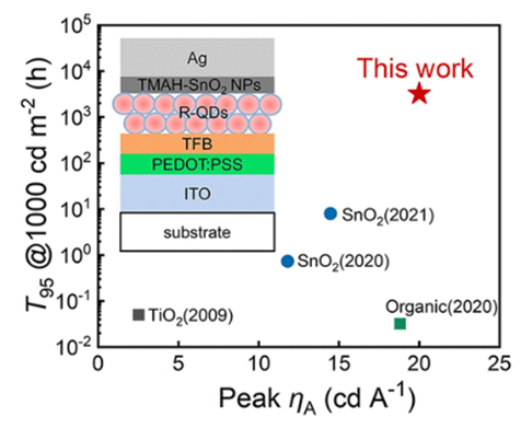 ZnO-based electron-transporting layers (ETLs) have been universally used in quantum-dot light-emitting diodes (QLEDs) for high performance. The active surface chemistry of ZnO nanoparticles (NPs), however, leads to QLEDs with positive aging and unacceptably poor shelf stability. SnO2 is a promising candidate for ETLs with less reactivity, but NP agglomeration in nonionic solvents makes the conventional device structure abandoned, resulting in QLEDs with extremely low operational lifetimes. The large barrier for electron injection also limits the electroluminescence efficiency. Here, we report one solution to all the above-mentioned problems. Owing to the strong HO–SnO2 coordination and the steric effect provided by the hydrocarbon groups, tetramethylammonium hydroxide can stabilize SnO2 NPs in alcohol, while its intrinsic dipole induces a favorable electronic-level shift for charge injection. The SnO2-based devices, with the conventional structure, exhibit not only the most efficient electroluminescence among ZnO-free QLEDs but also an operational lifetime (T95) over 3200 h at 1000 cd m–2, which is comparable with that of state-of-the-art ZnO-based devices. More importantly, the superior shelf stability means that the TMAH–SnO2 NPs are promising to enable QLEDs with real stability.