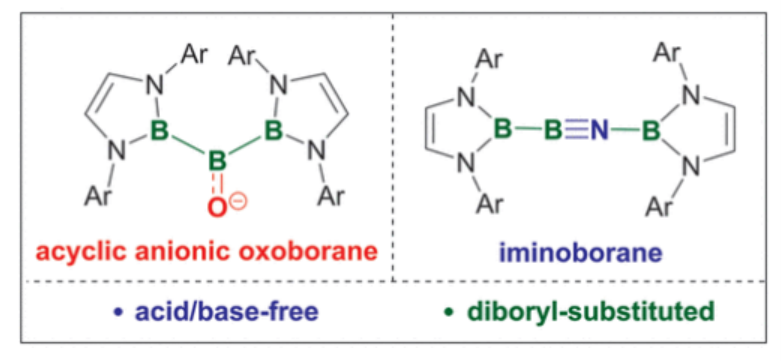 Anionic oxoboranes and neutral iminoboranes, which are isoelectronic to ketones and alkynes, respectively, have attracted much attention because of their unique structures and various reactivity. However, acid/base-free oxoboranes and iminoboranes are still limited, and readily accessible examples with diverse electronic and steric characteristics are highly desirable. Herein, we report the first syntheses of the acyclic anionic oxoborane 2 and iminoborane 4 bearing two boryl ligands, both of which are acid/base-free. Spectroscopic analysis, X-ray crystallography, and theoretical calculations reveal that 2 and 4 possess a polarized terminal B═O double bond and central B≡N triple bond, respectively.