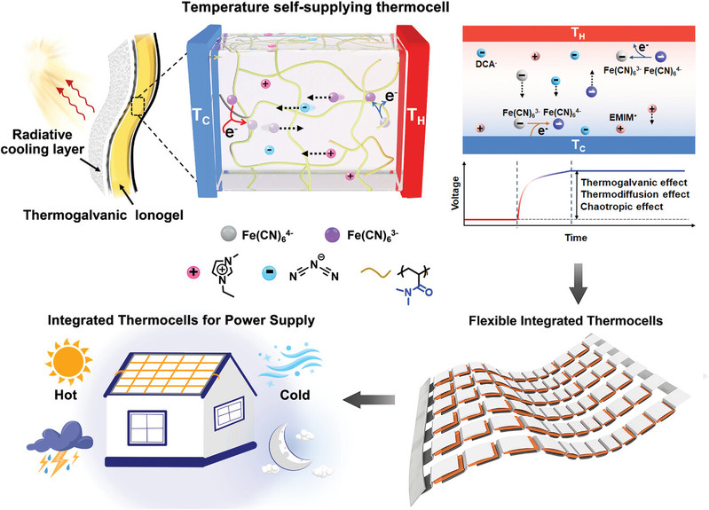 Abstract: Ionic thermocells convert heat into electricity and are promising power sources for electronic devices. However, discontinuous and small electricity output limits practical use under varying environmental conditions. Here, a thermogalvanic ionogel with a high Seebeck coefficient (32.4 mV K−1) is designed. Thermocells that combine thermogalvanic ionogel-based thermocells, which realize all-weather power generation via passive radiative cooling, are also developed. These thermocells generate electricity continuously under varying weather conditions and over a wide temperature range (−40 to 90 °C), with a normalized power density of 25.84 mW m−2 K−2. Advanced characterization shows that the chaotropic effect enhances the Seebeck coefficient, while the self-supplying temperature difference given the radiative cooling structure enables all-weather power generation. These results provide an effective strategy for developing practical thermocells suitable for diverse daily and seasonal variations.