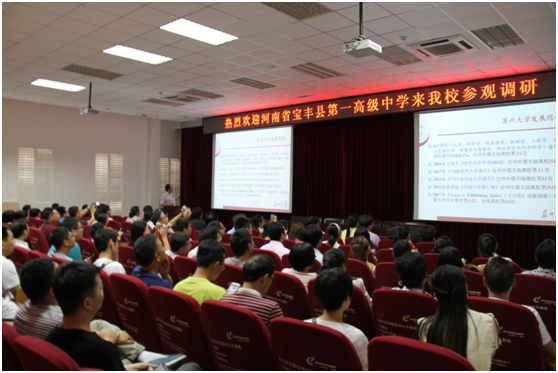 姚建林主任对宝丰县第一高级中学教师的到来表示热烈欢迎,并从顶层设计、学科专业建设、人才培养模式、学生就业等方面介绍了苏州大学以及学部的综合发展情况。他指出,高校应致力于培养具有健全人格和社会责任感,具备理论知识、专业技能和创新创业能力的高级应用型专门人才。他提出双方应进一步深化了解,积极寻找合作的契合点,希望宝丰县第一高级中学为苏州大学输送更多的优质生源,促进共同发展。
