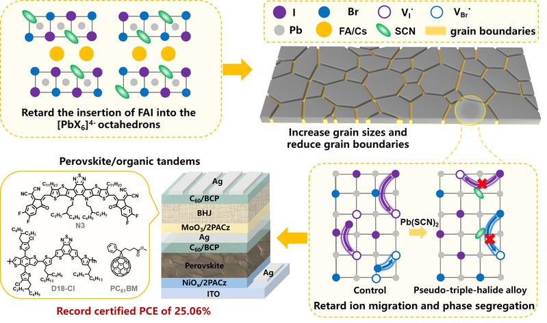 为了解决上述问题,李耀文教授课题组通过构筑I/Br/SCN拟三卤素合金钙钛矿,通过结晶动力学调控对宽带隙钙钛矿的宏观薄膜形貌、微观晶格组分以及器件光伏性能进行链条式研究,有效阻断了离子迁移途径,全面抑制卤素离子在晶格和薄膜中的迁移与相分离。宽带隙钙钛矿太阳能电池的能量损失显著降低,并获得了世界纪录认证效率(25.06%)的钙钛矿/有机叠层太阳能电池,加速推动了钙钛矿/有机叠层太阳能电池的产业化进程。