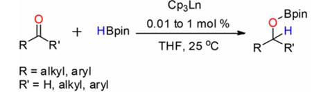 It was found that homoleptic cyclopentadienyl lanthanide complexes Cp3Ln (Ln = Y (1), Yb (2), Sm (3), Nd (4), La (5), Cp = cyclopentadienyl) can be employed as excellent catalysts for the hydroboration of various aldehydes and ketones toward pinacolborane. These robust lanthanide catalysts exhibited high reactivity with low catalyst loadings (0.01–1 mol %) under mild conditions and good functional group tolerability. These complexes also demonstrated uniquely carbonyl-selective hydroboration in the presence of alkenes and alkynes.