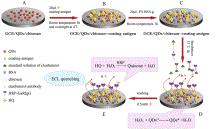 An ultrasensitive electrochemiluminescence (ECL) immunosensor based on CdSe quantum dots (QDs) has been designed for the detection of clenbuterol. The immunosensor was fabricated by layer by layer and characterized with atomic force microscopic images (AFM) and electrochemical impedance spectra (EIS). In oxygen-saturated pH = 9.0 Tris-HCl buffer, a strong ECL emission of QDs could be observed during the cathodic process due to the H2O2 product from electrochemical reduction of dissolved oxygen. Upon the formation of immunocomplex, the second antibody labeled with horseradish peroxidase was simply immobilized on the electrode surface. The ECL emission decreased since steric hindrance of the immunocomplex slowed down the electron-transfer speed of dissolved oxygen, and also could be greatly amplified by an enzymatic cycle to consume the self-produced coreactant. Using clenbuterol as model analyte, the ECL intensity was determined by the concentration of competitive immunoassay of clenbuterol with a wide calibration in the range of 0.05 ng mL−1 to 1000 ng mL−1, and a low detection limit was 0.02 ng mL−1. The immunosensor shows good stability and fabrication reproducibility. It was applied to detecting practical samples with the satisfactory results. This immunosensing strategy opens a new avenue for detection of residue and application of QDs in ECL biosensing.