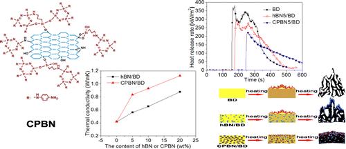 A novel hybridized multifunctional filler (CPBN), cyclotriphosphazene/hexagonal boron nitride (hBN) hybrid, was synthesized by chemically coating hBN with hexachlorocyclotriphosphazene and p-phenylenediamine, its structure was systemically characterized. Besides, CPBN was used to develop new flame retarding bismaleimide/o,o′-diallylbisphenol A (BD) resins with simultaneously high thermal conductivity and thermal stability. The nature of CPBN has a strong influence on the flame behavior of the composites. With the addition of only 5 wt % CPBN to BD resin, the thermal conductivity increases 2 times; meanwhile the flame retardancy of BD resin is remarkably increased, reflected by the increased limited oxygen index, much longer time to ignition, significantly reduced heat release rate. The thermogravimetric kinetics, structures of chars and pyrolysis gases, and cone calorimeter tests were investigated to reveal the unique flame retarding mechanism of CPBN/BD composites. CPBN provides multieffects on improving the flame retardancy, especially in forming a protective char layer, which means a more thermally stable and condensed barrier for heat and mass transfer, and thus protecting the resin from further combustion.