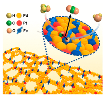 Spin engineering provides a powerful strategy for manipulating the interaction between electrons in the d orbital and oxygen-containing adsorbates, while a little endeavor was performed to understand whether such a strategy can make a prosperous enhancement for fuel electrooxidations. Herein, we demonstrate that spin engineering of trimetallic Pd–Fe–Pt nanomeshes (NMs) can achieve superior enhancement for fuel electrooxidations. Magnetization characterizations reveal that Pd59Fe27Pt14 NMs own the highest number of polarized spins (μb = 0.85 μB/f.u.), playing an important role on facilitating the adsorption of OHads to promote the oxidation of COads, as confirmed by theoretical results. Consequently, the optimized Pd59Fe27Pt14 NMs exhibit excellent methanol oxidation reaction activity and stability with a mass activity of 1.61 A mgPt–1, 2.6-fold and 7.3-fold larger than those of PtRu/C and Pt/C. Such catalysts also present exceptional performances in ethanol oxidation and formic acid oxidation reactions. Our work highlights a new strategy for designing efficient electrocatalysts for fuel electrooxidations and beyond.