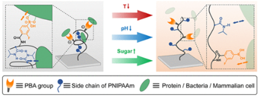 Stimuli-responsive biointerfaces can serve as dynamic tools for modulation of biointerfacial interactions. Considering the complexity of biological environments, surfaces with multistimulus responsive switchable bioactivity are of great interest. In the work reported herein, a multistimulus responsive biointerface with on–off switchable bioadhesion (protein adsorption, bacterial adhesion, and cell adhesion) and surface functions in response to change in temperature, pH, or sugar content is developed. This surface is based on a silicon modified with a copolymer containing a thermoresponsive component (poly(N-isopropylacrylamide)) and a component, phenylboronic acid, that can form pH-responsive and sugar-responsive dynamic boronate ester bonds with diol-containing molecules. It is shown that biointeractions including protein adsorption and release, bacteria and cell attachment and detachment on this surface can be regulated by changing temperature, pH, and sugar content of the medium, either individually or all three simultaneously. Furthermore, this surface can switch between two different functions, namely between killing and releasing bacteria, by introduction of a diol-containing biocidal compound. Compared to switchable surfaces that are responsive to only one stimulus, our multistimulus responsive surface is better adapted to respond to the multifunctional complexities of the biological environment and thus has potential for use in numerous biomedical and biotechnology applications.