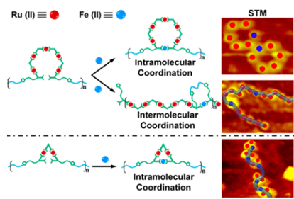 During the past few decades, the study of the single polymer chain has attracted considerable attention with the goal of exploring the structure–property relationship of polymers. It still, however, remains challenging due to the variability and low atomic resolution of the amorphous single polymer chain. Here, we demonstrated a new strategy to visualize the single metallopolymer chain with a hexameric or trimeric supramolecule as a repeat unit, in which Ru(II) with strong coordination and Fe(II) with weak coordination were combined together in a stepwise manner. With the help of ultrahigh-vacuum, low-temperature scanning tunneling microscopy (UHV-LT-STM) and scanning tunneling spectroscopy (STS), we were able to directly visualize both Ru(II) and Fe(II), which act as staining reagents on the repeat units, thus providing detailed structural information for the single polymer chain. As such, the direct visualization of the single random polymer chain is realized to enhance the characterization of polymers at the single-molecule level.