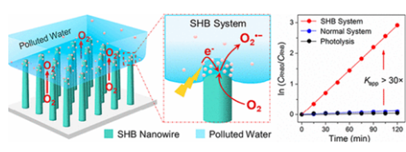 The use of photocatalysis for water purification and environmental protection is of key interest. However, the reaction kinetics can be limited by the restricted accessibility of electron acceptor oxygen and the low adsorption of organic compounds—crucial factors underlying photocatalytic performance. Here we simultaneously alleviate these constraints via reaction interface microenvironment design using superhydrophobic (SHB) TiO2 nanoarrays as a model photocatalyst. The low surface energy and rough surface microstructure features of the SHB nanoarrays give the photocatalytic system long-range hydrophobic force and an air–water–solid triphase reaction interface. This simultaneously changes the adsorption model of organic compounds and the access pathway of oxygen, leading to a markedly enhanced adsorption capacity and higher interfacial oxygen levels. These synergistic qualities result in over 30-fold higher reaction kinetics versus a normal diphase system. In addition, this photocatalytic system is stable via repeated cycling. Our findings highlight the importance of reaction interface microenvironment design and reveal an effective path for the development of efficient photocatalysis systems.