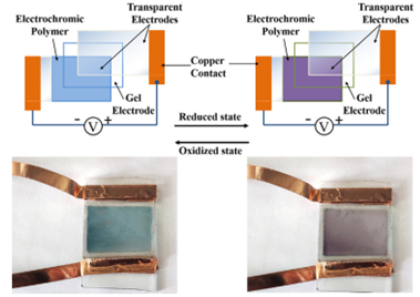 Electrochromic devices with low-cost, energy-saving advantages, and controllable color switching have gained widely attention. Yet, electrochromic materials are limited for smart window due to challenges such as difficulty freestanding, monotonous color change, slow switching capability, and low optical contrast. In this work, a freestanding copolymers based on Poly(N-vinylcarbazole) (PVK) and 3, 4-ethoxylenedioxythiophene (EDOT) are designed. The copolymer as-synthesized by the good secondary film-forming of PVK not only contains the freestanding property of PVK, but also possesses the excellent electrical and electrochemical properties of poly(3, 4-ethoxylenedioxythiophene) (PEDOT). The freestanding copolymer was used to create the multicolor: brown, dark brown, purple, and blue. A high optical contrast of up to 39.1% and a color efficiency of up to 107.00 cm 2C−1 prove a significant coloration and bleaching effect, which is satisfactory for the application of electrochromic devices. Further, an electrochromic device based on P(PVK-co-EDOT) as coloring materials is constructed. This work contributes new ideas into the design of electrochromic smart materials.